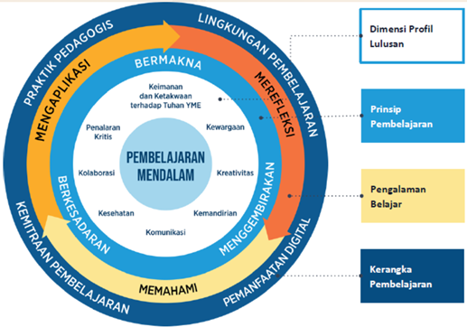 - Praktik Pedagogis: Strategi mengajar yang dipilih guru untuk mencapai tujuan belajar dalam mencapai dimensi profil lulusan. Untuk mewujudkan pembelajaran mendalam guru berfokus pada pengalaman belajar peserta didik yang autentik, mengutamakan praktik nyata, mendorong keterampilan berpikir tingkat tinggi dan kolaborasi.